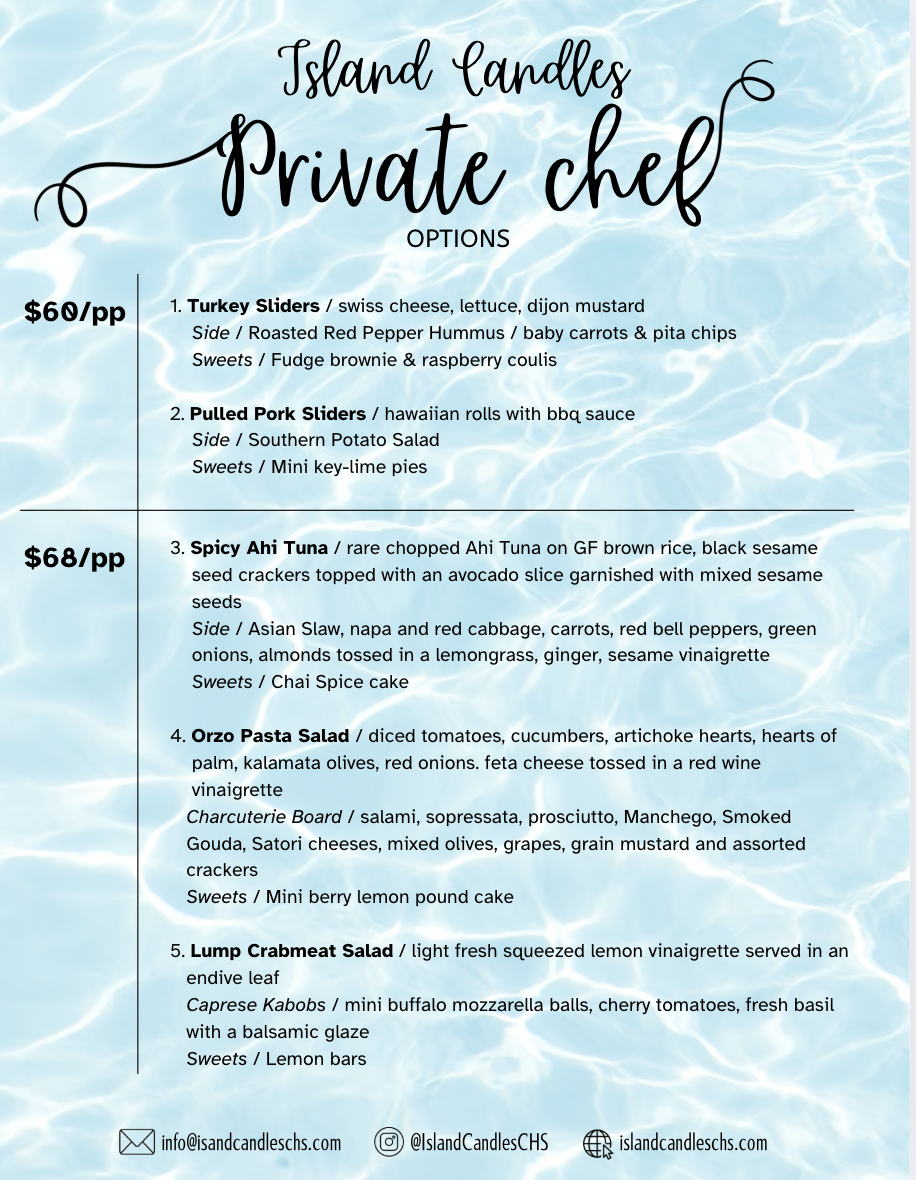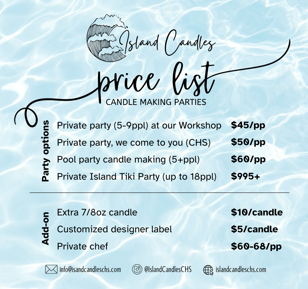 Contact us to book your private candle making party (pool party, tiki boat private island party, we will come to you). We offer additional professional photography AND a private chef options by Seasons Personal Chef, shown below the booking portal.