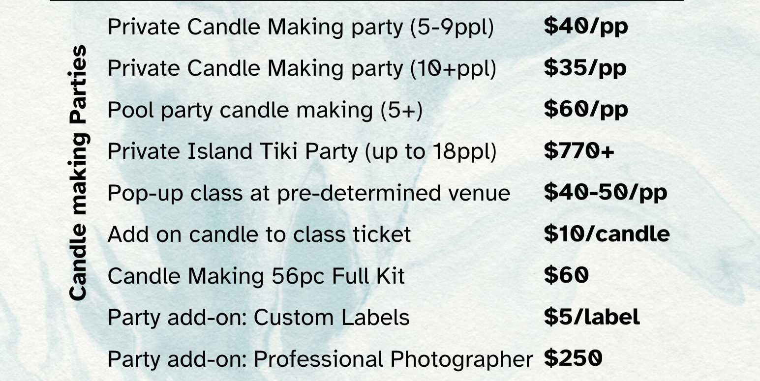 Get 2 hours at a private pool on James Island AND Candle making party! You get to swim while your candles fry & take your customized homemade candle home with you after the party! 5 person minimum to book, starting at $60/pp. Add on customized candle labels for only $5/label/candle.